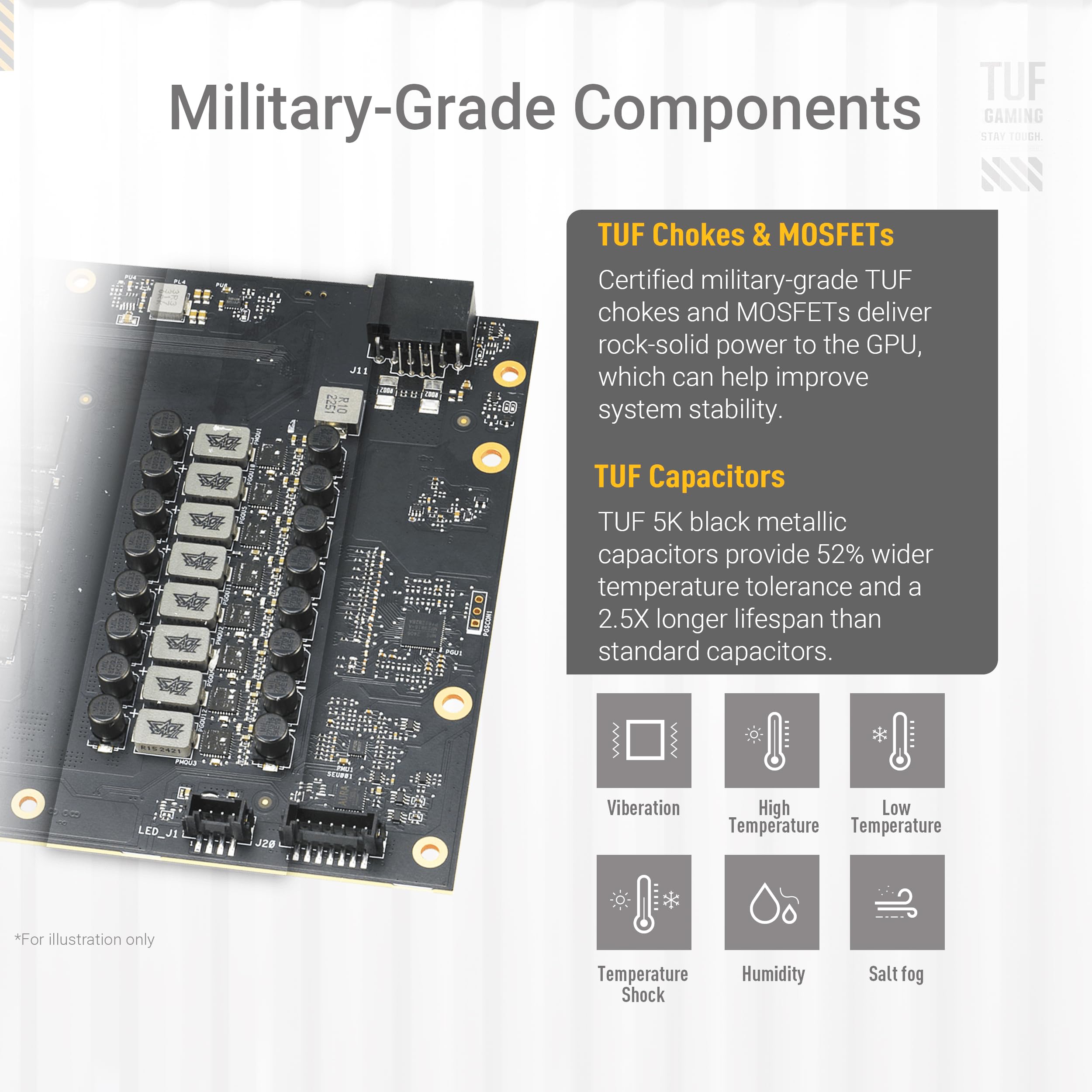 Details: NVIDIA Blackwell architecture is elevated by enhanced cooling and power delivery, fortified with rugged reinforcements for exceptional durability. Lock, load, and dominate with the ASUS TUF Gaming GeForce RTX™ 5070 Ti, designed to withstand the harshest conditions, and deliver unparalleled performance.