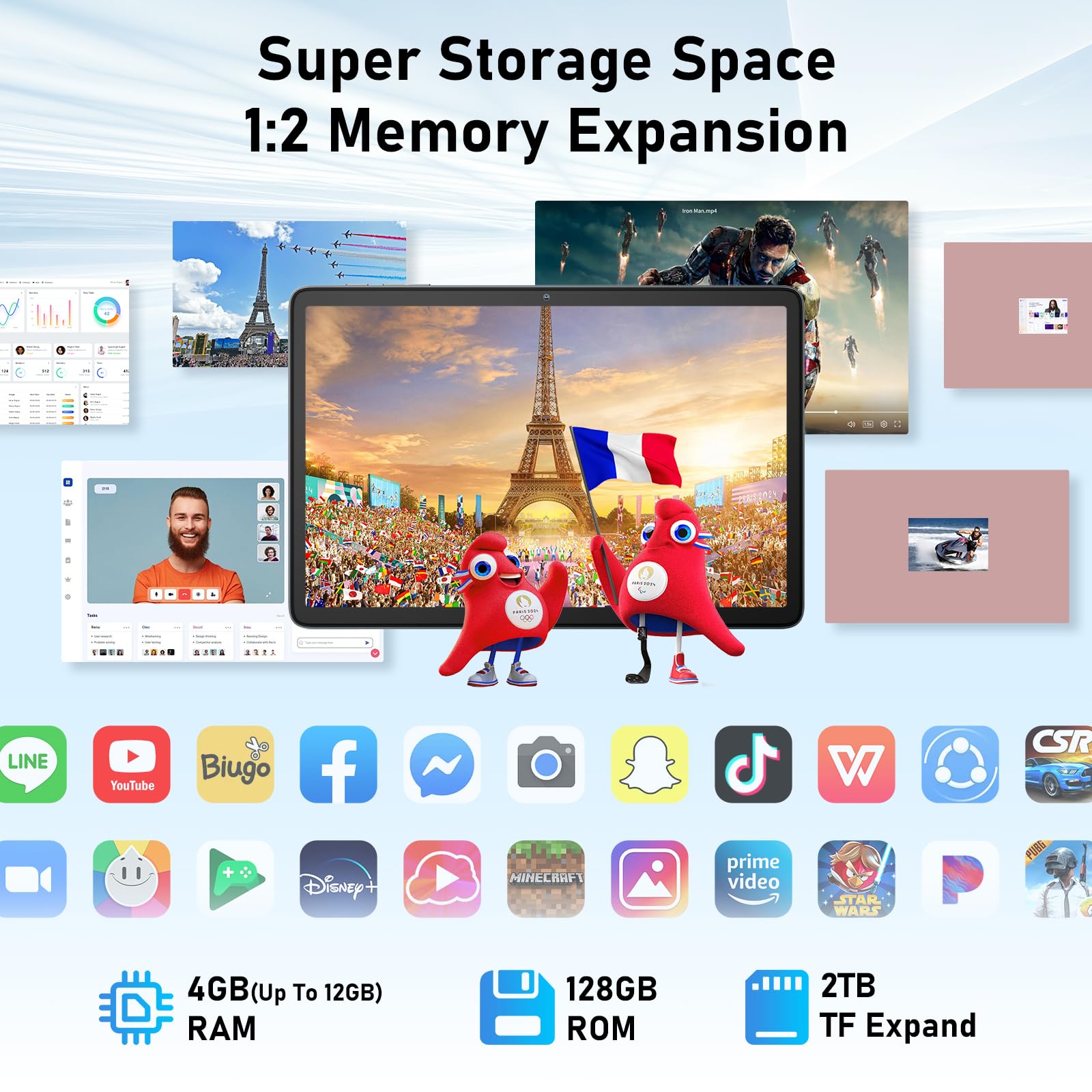 【12GB RAM + 128GB ROM】 This 10-inch tablet features 12GB RAM (including 4GB base memory and 8GB extended memory) and 128GB of internal memory with support for a 2TB TF card, which means you can store a lot of apps, videos, pictures, and files without worrying about space. Atomised Memory intelligently allocates memory to improve performance and frees up an additional 5-9% of running memory for other processes or more background applications.