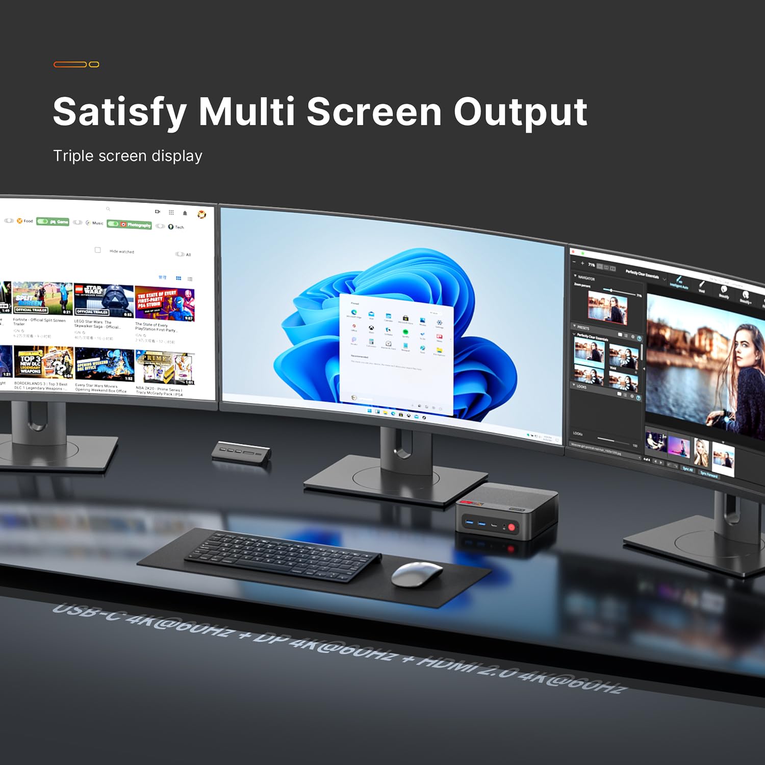 【4K TRIPLE DISPLAY OUTPUTS】Mini gaming pc office supports triple display output with HDMI, DisplayPort and Type-C ports. The GPU adopts Radeon Graphics (8 GPU cores), the clock speed is 2000MHz, supports ultra-realistic 4K visual effects, which can provide incredible clarity and maximum work efficiency.