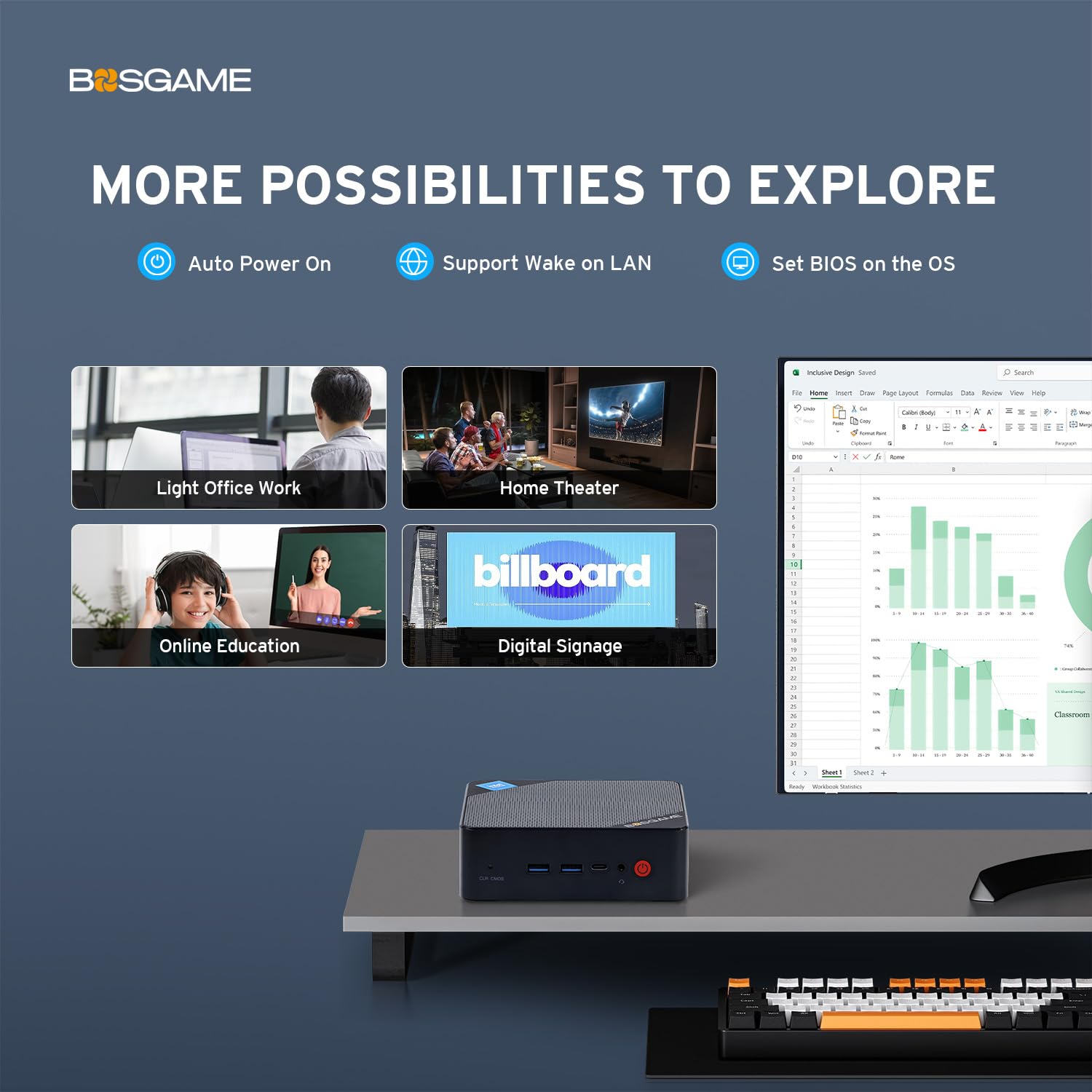 🌠【Rich I/0 Ports Connect Convenience】The BOSGAME mini PC B100 well-equipped with a variety of I/O ports, catering to both office and home entertainment needs. The inclusion of 4 USB3.2 ports, 2 HDMI ports, a full-function USB-C port, a 2.5G RJ45 LAN port, and an audio jack provides users with ample connectivity options for peripherals, displays, networking, and audio devices.