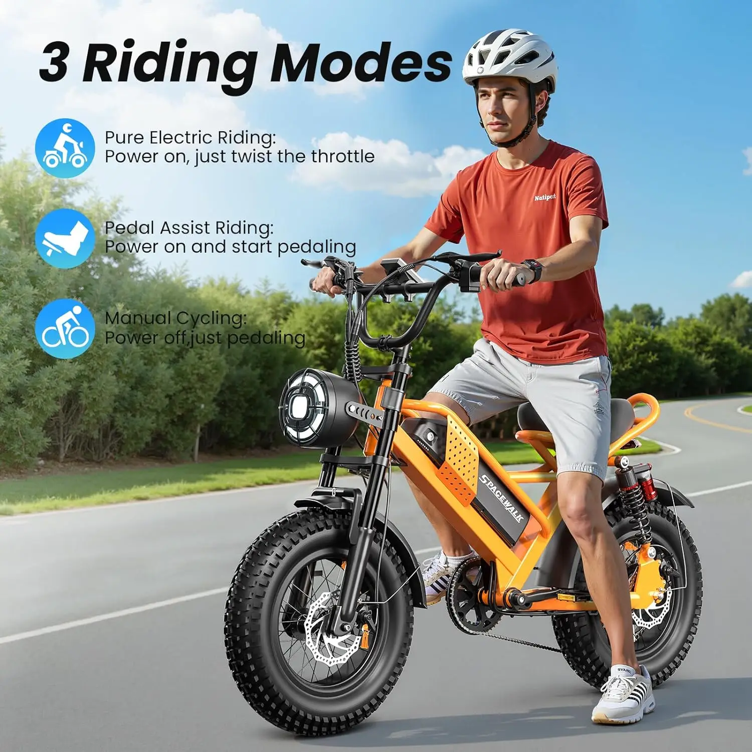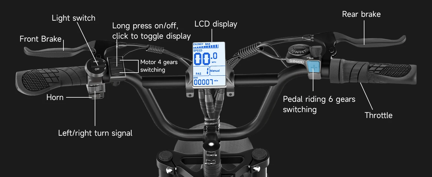 - 3 Riding Modes:(1)Pure Electric Mode:No pedaling needed,with 3 adjustable speeds. (2)Pedal Assist Mode:Easier pedaling for longer distances. (3)Pedal Mode:Equipped with Shimano 6-speed gearing for precise power transfer and a more comfortable ride.Turn off the motor and start your workout.