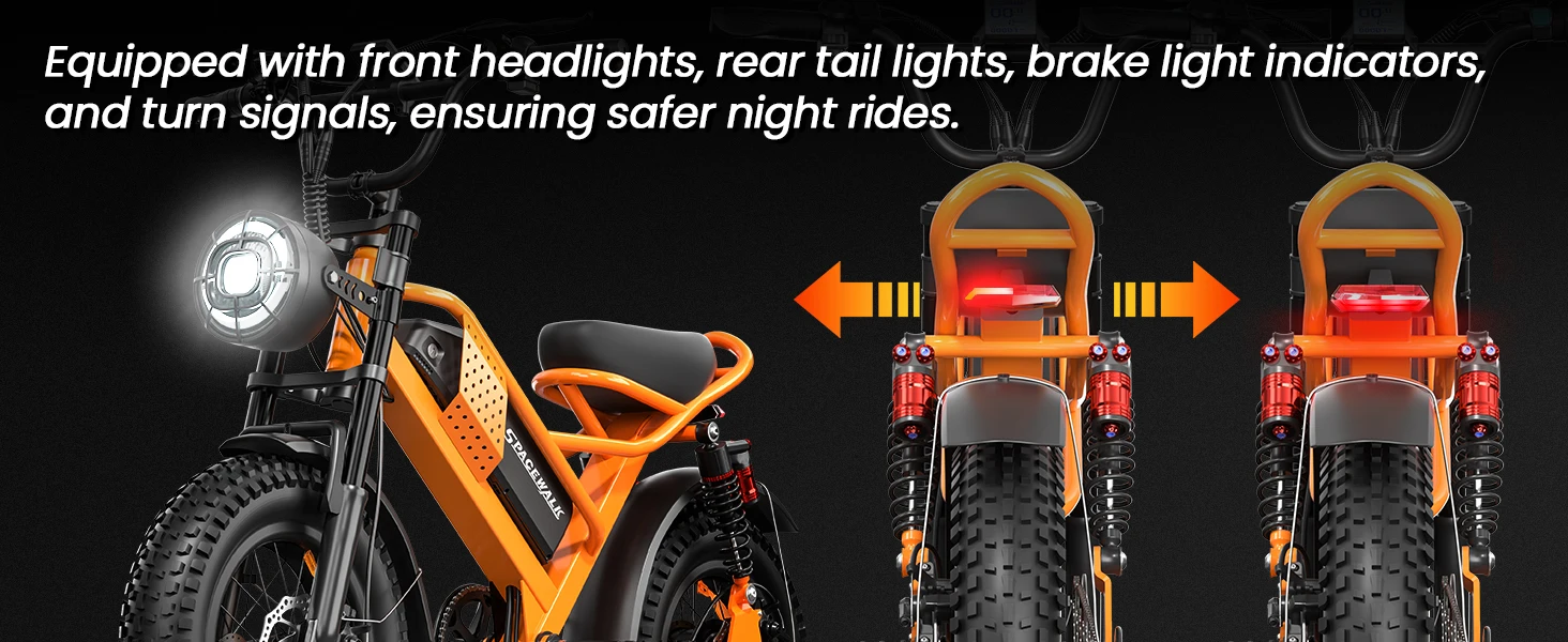 - LCD Display & Lighting:Features an LCD screen that shows various parameters,such as battery level,speed,distance traveled.Click the M button on the left handlebar to toggle more parameters.Equipped with front and rear lights,as well as rear turn signals,ensuring safe riding even at night.