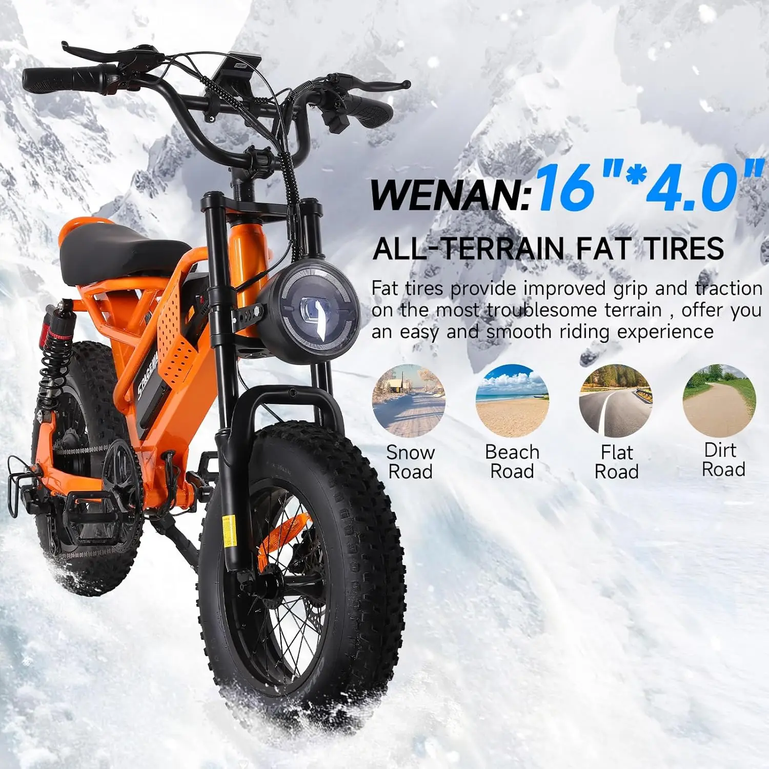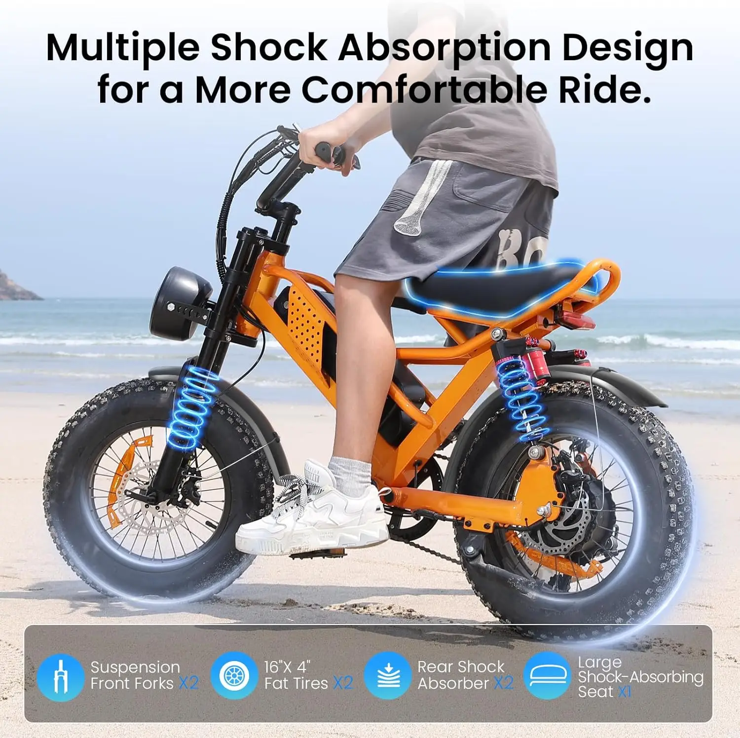 - Enhanced Shock Absorption: Equipped with 4 shock absorbers (front and rear),a large shock-absorbing seat,and fat tires for extra cushioning,ensuring a more comfortable ride.All-terrain tires suitable for mountain,sand,snow,and grass surfaces.