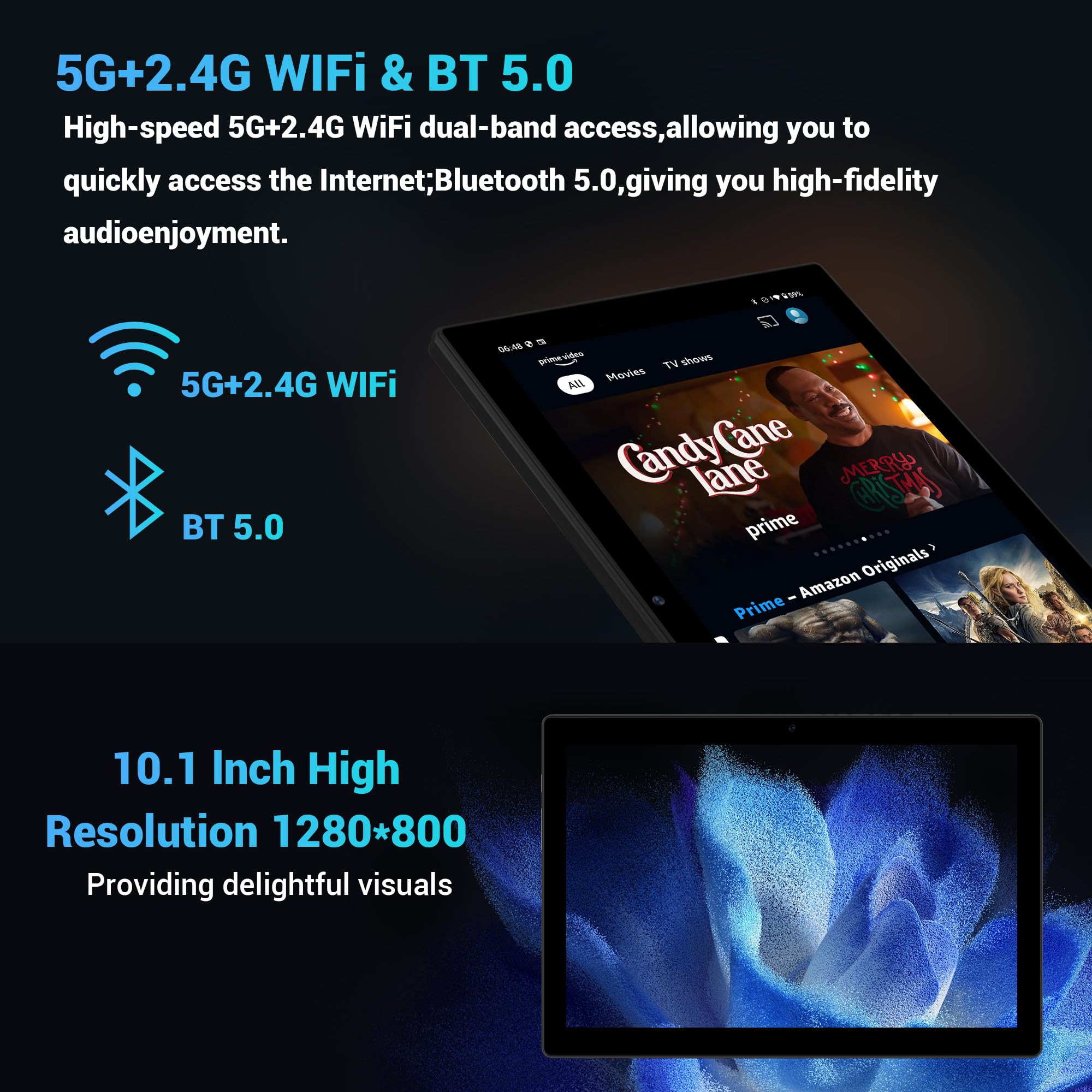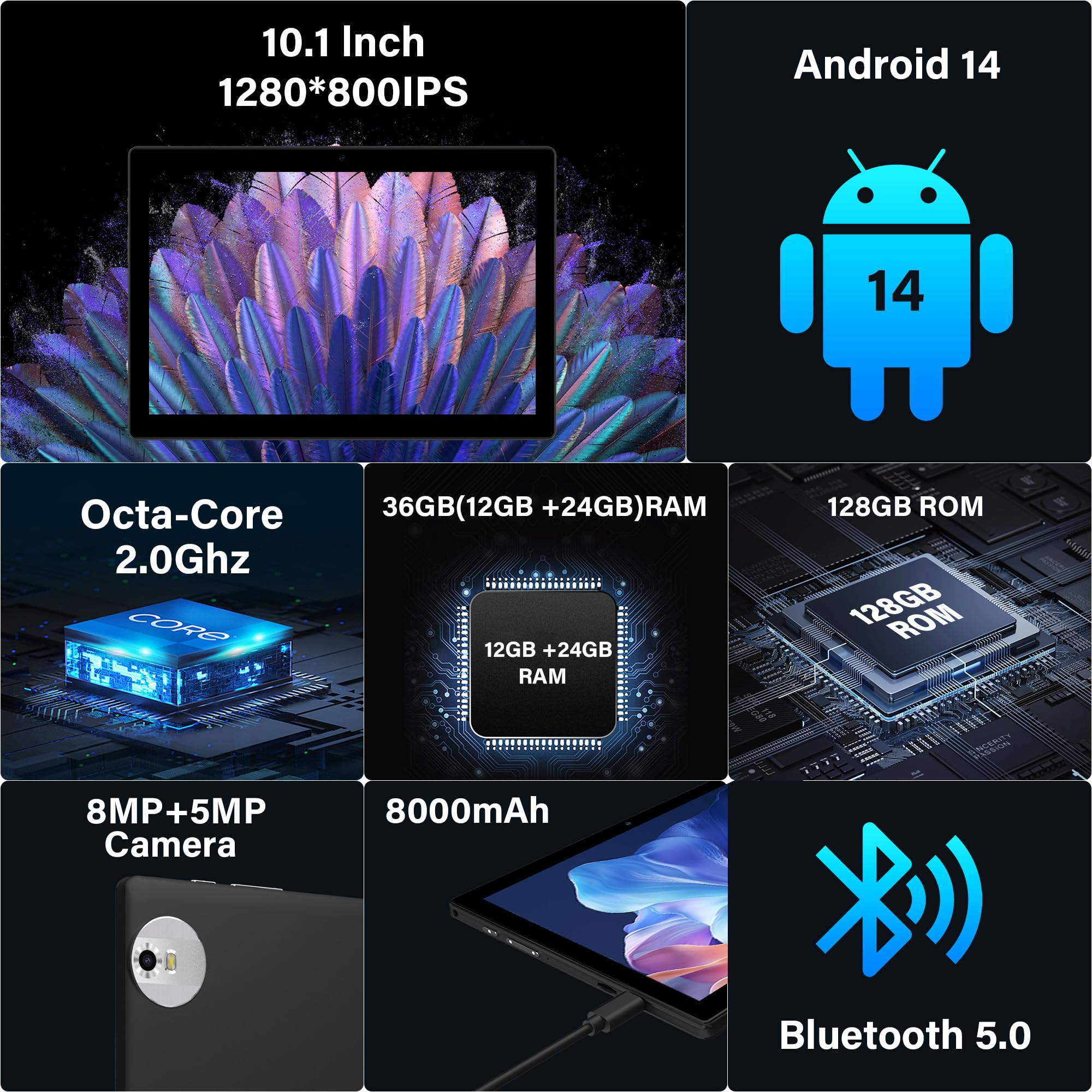 【2.4G+5GWiFi+Bluetooth 5.0】Android 14 tablet supports 2.4+5Ghz WiFi ,2.4GHz WiFi signal is stable and long-range, while 5.0GHz WiFi has a higher frequency and is faster for stable, uninterrupted connectivity and superior Internet connections regardless of the wireless network channel used. Equipped with Bluetooth 5.0, it offers wider coverage, higher transmission speed and greater compatibility.
