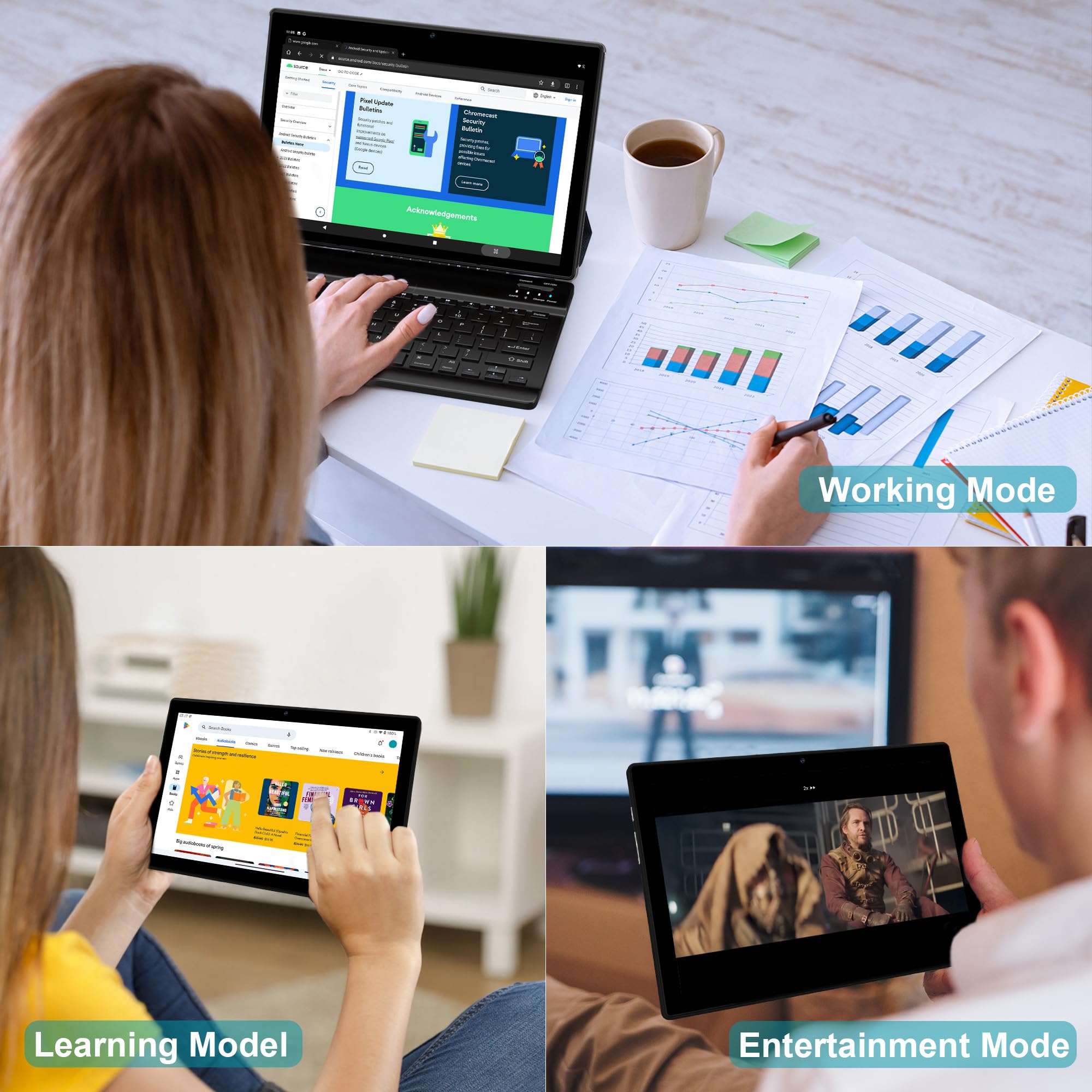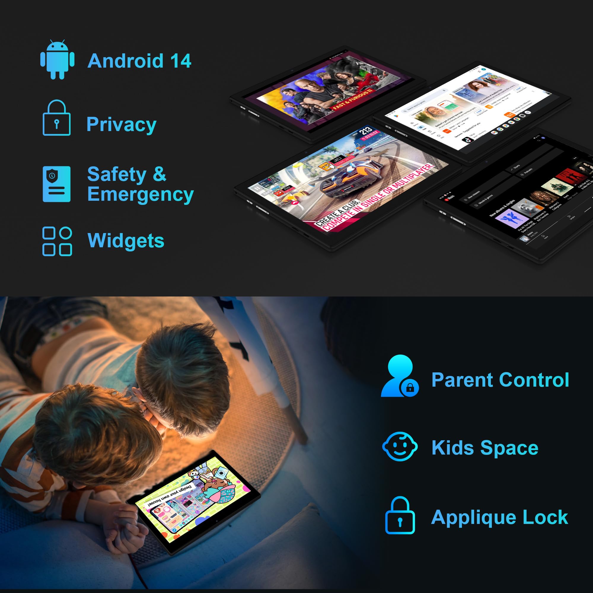 【Powerful Android 14 system】Tablets are equipped with the powerful and easy-to-use Android 14 operating system.The new privacy function protects your personal data. With clear and comprehensive view of the time the app can access to your location, camera or microphone.Thanks to the simple interface and fast operation, you can easily manage your movies, pictures, videos, music and more.