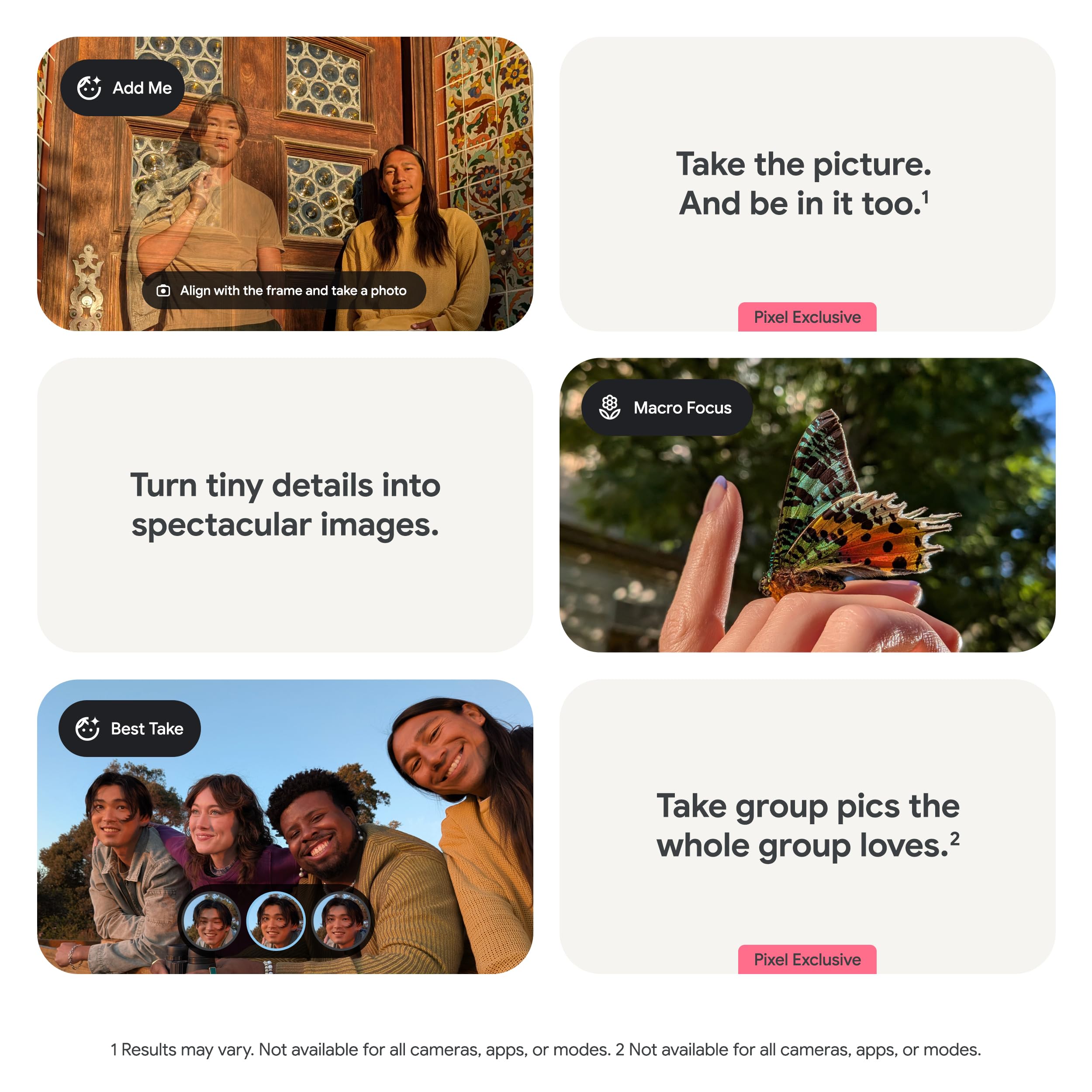 Take the picture. And be in it too. Add Me makes sure no one is left out of a photo. Take one with the group, then swap in the photographer. Pixel magically merges both.