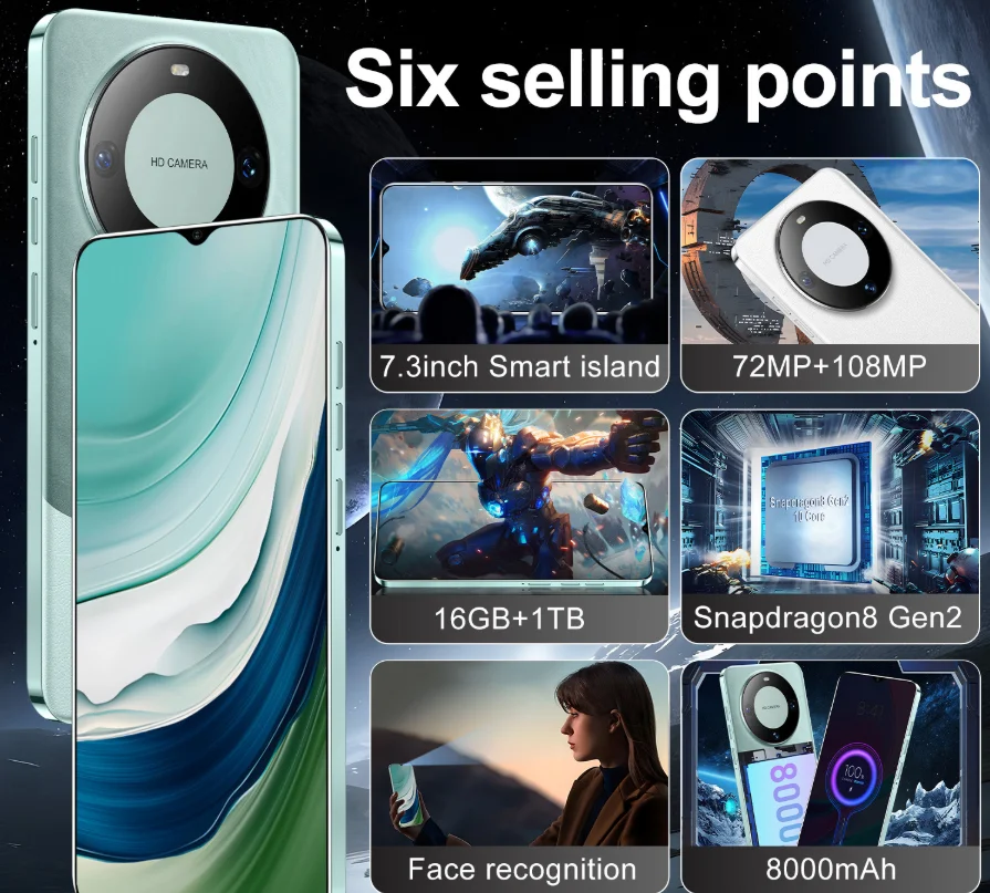 HiCyber New 60 7.3 Inch Full Screen 5G Android 10 Gaming Smartphone with Quad Core CPU Snapdragon 800 Series 90Hz 108MP
