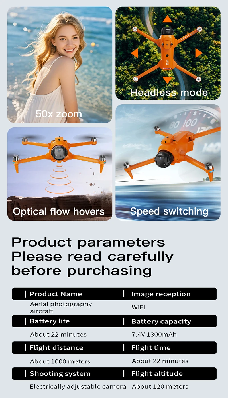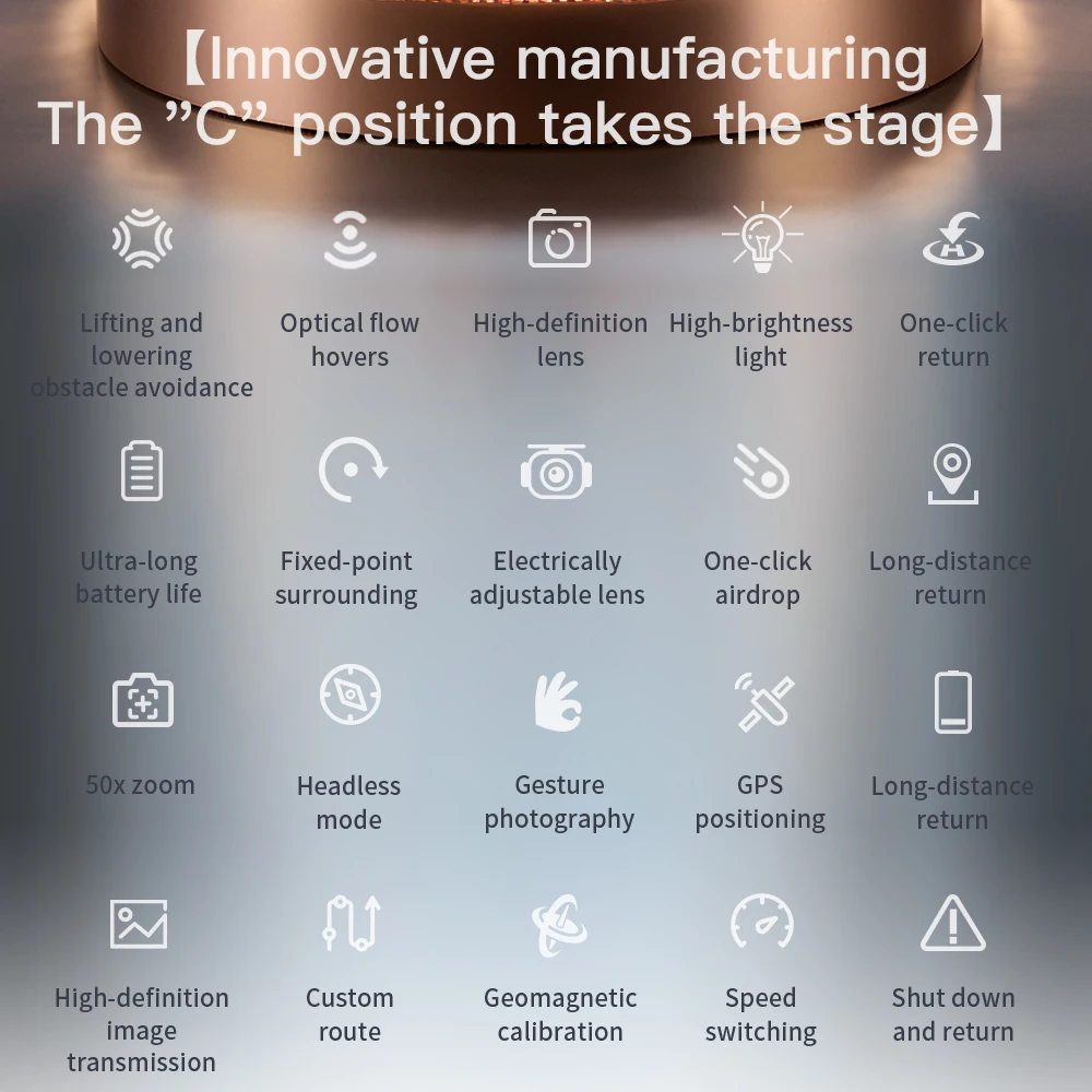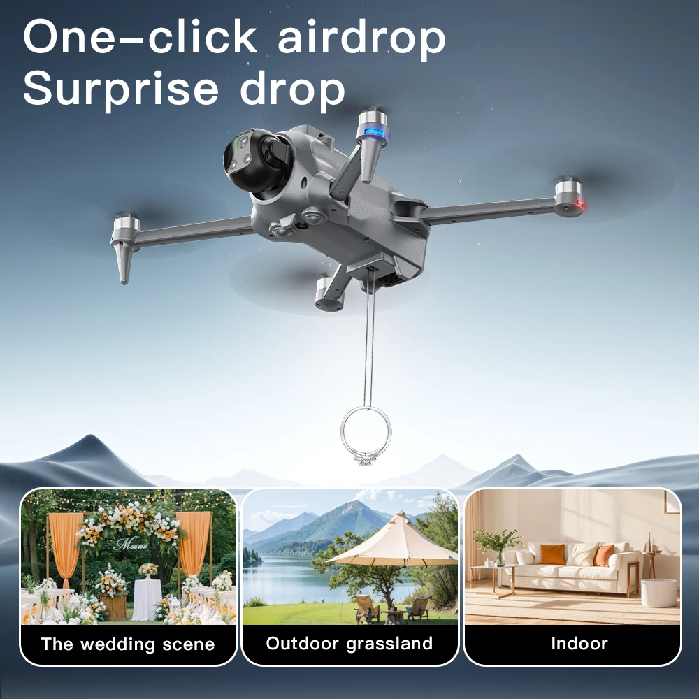 high-definition WlFl + 180 electric adjustment on the frontlens, bottom high-definition WFl with optical flow precise positioning, super long battery life7.4V large battery, low battery/out of control/over distance Return to home, intelligent follow, flyaround points, lift and avoid obstacles indoors, with airdrop function at the bottom, remotecontrol with voice prompt function, App mobile phone control, custom route, one-click return.ascend and descend, forward and backward, fly left and right, headless mode, automaticswitching of optical flow/GPS |