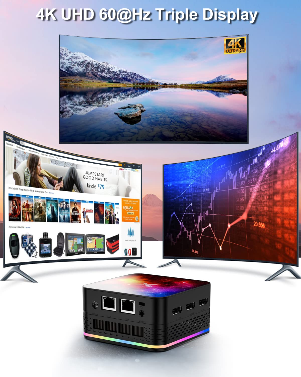 【Small Size and Multiple Ports】The mini desktop computer adopts 3 x USB3.1 ports, 3 x HDMI ports, 2 x RJ45 Gigabit Ethernet ports, 1 x Audio port and 1 x DC port designs. In addition, the mini computer supports automatic power on function and comes with RGB lighting.The micro computer weighs about 0.2kg, making it easy to carry around.