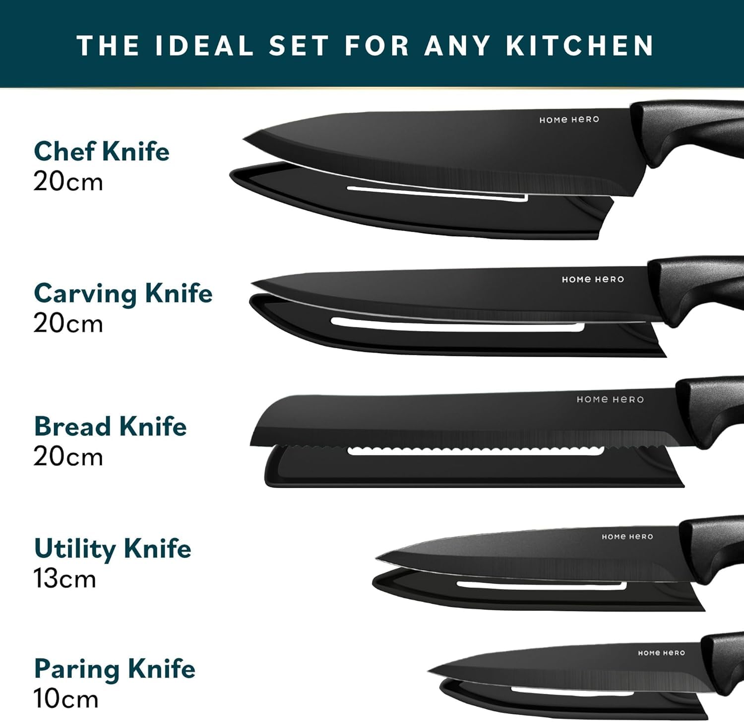 Blade EdgePlain, Serrated About this item Eye-Catching Black Knife Set – This black kitchen knife set includes a a 20cm chef knife, a 20cm carving knife, a 20cm bread knife, 10cm paring knife, a 13cm utility knife with individual sheaths and a two-stage sharpener!