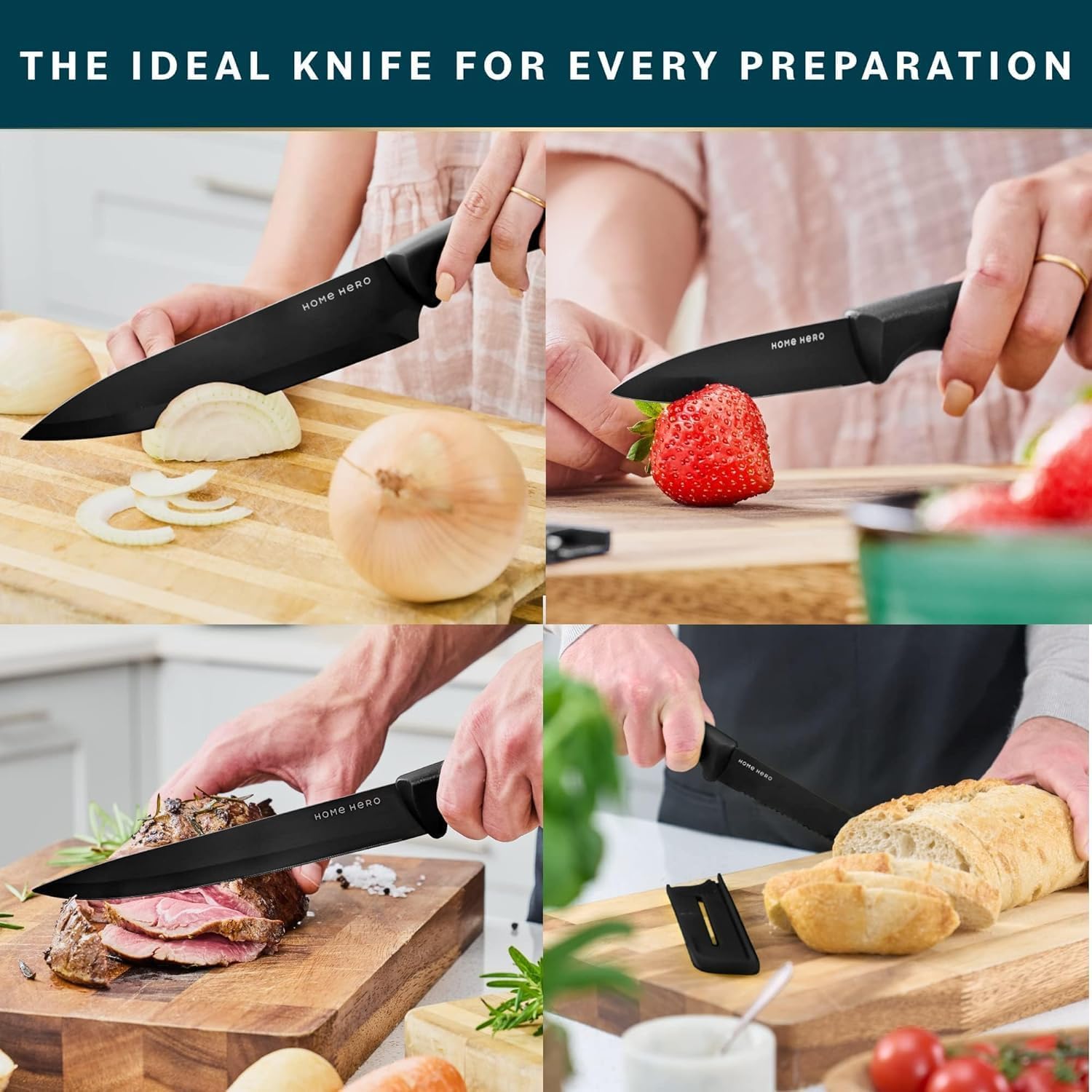 Premium Stainless Steel – Made with durable 3Cr13 stainless steel, this sharp kitchen knife set will help you slice, dice, and chop to your heart’s content. And to keep them sharp for longer, the sheaths will protect the blades when not in use!