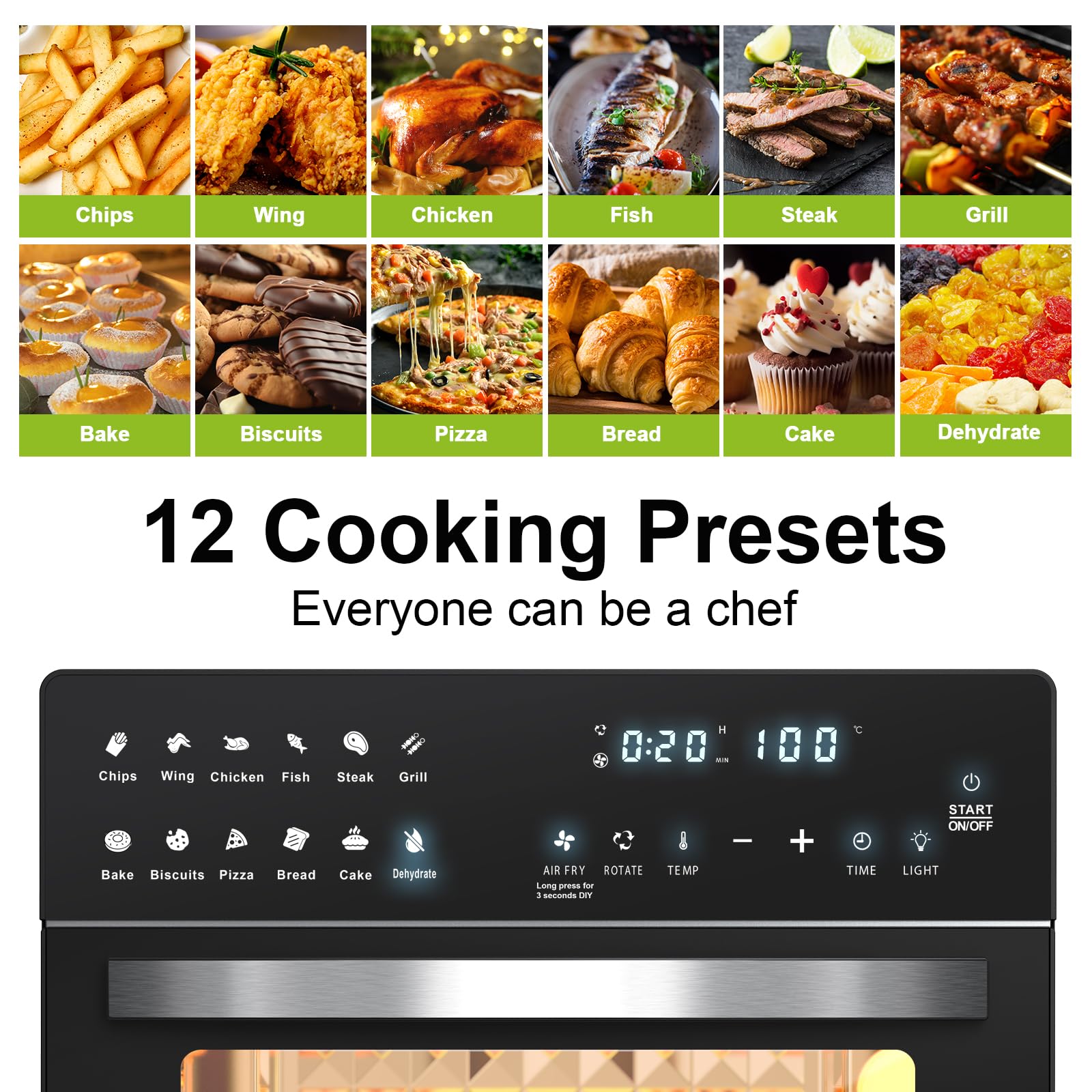 【Here is our multi-functional air fryer oven with rotisserie for your food discovery!】 With 12 preset programs, you can enjoy all kinds of food, such as meats, sea foods, chips, kebabs, cakes, cookies, croissants, vegetables and toasts. Provided with detailed user manual and clear recipe book, it’s no longer tough to cook