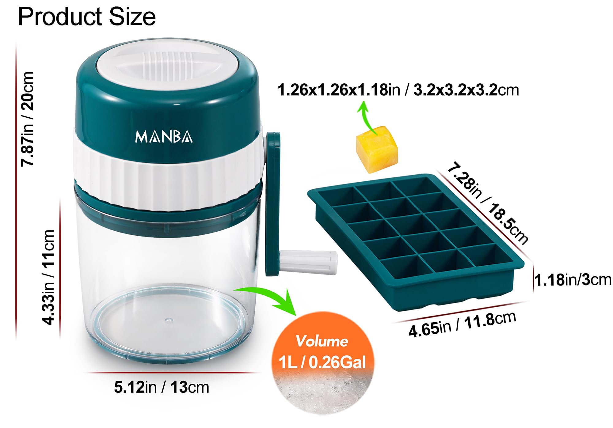 Includes: 1 x Ice Crusher to crush ice cubes into fluffy snow-like ice, 1 x Ice Cube Mold to freeze 15pcs of cubic ice blocks. Both ice blocks and snow cone shaved ice are easy available for your slushies, margaritas, funny drinks and more