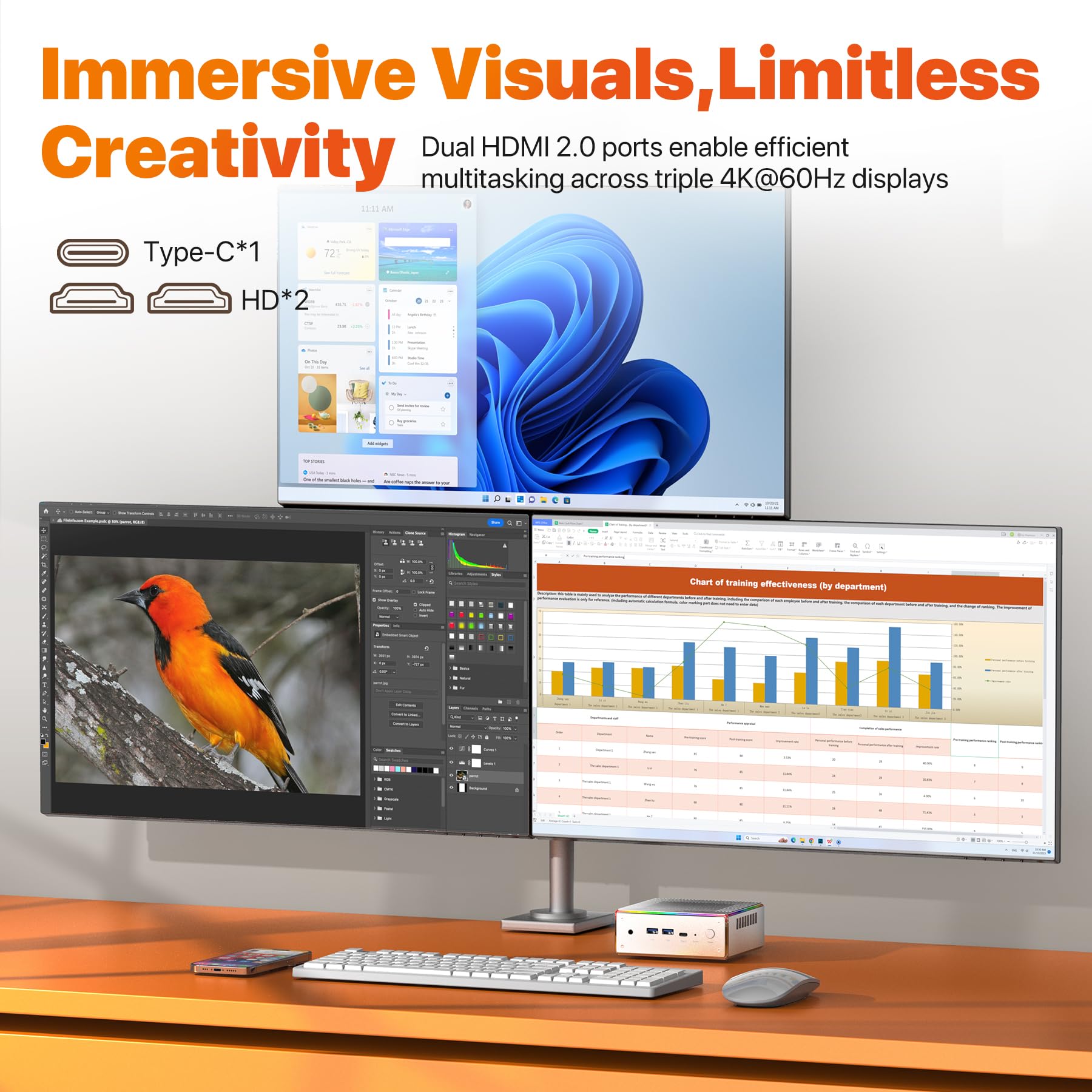 45W High Performance Mini PC:The PELADN HA-4 Mini PC packs a punch with its AMD Ryzen 7 7735HS processor. With 8 cores and 16 threads, a 6nm manufacturing process, and 16MB of smart cache, this mini PC can achieve dynamic frequencies of up to 4.75GHz. Powered by the Zen 3+ architecture and boasting a maximum 54W TDP, this Ryzen mini PC is a multitasking powerhouse. It excels at handling tasks such as spreadsheets, email, coding applications, web browsing, photo/video editing, and even light gaming (CS:GO, PUBG, DOTA 2, League of Legends, and more).