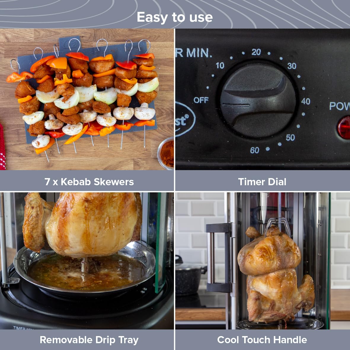 FANTASTIC MEAL OPTIONS – This electric rotisserie grill allows you to make delicious takeaway style meals in an instant. Cook anything from kebabs and skewers, to full joints of meat, and grilled vegetables & fish. The only limit is your imagination!