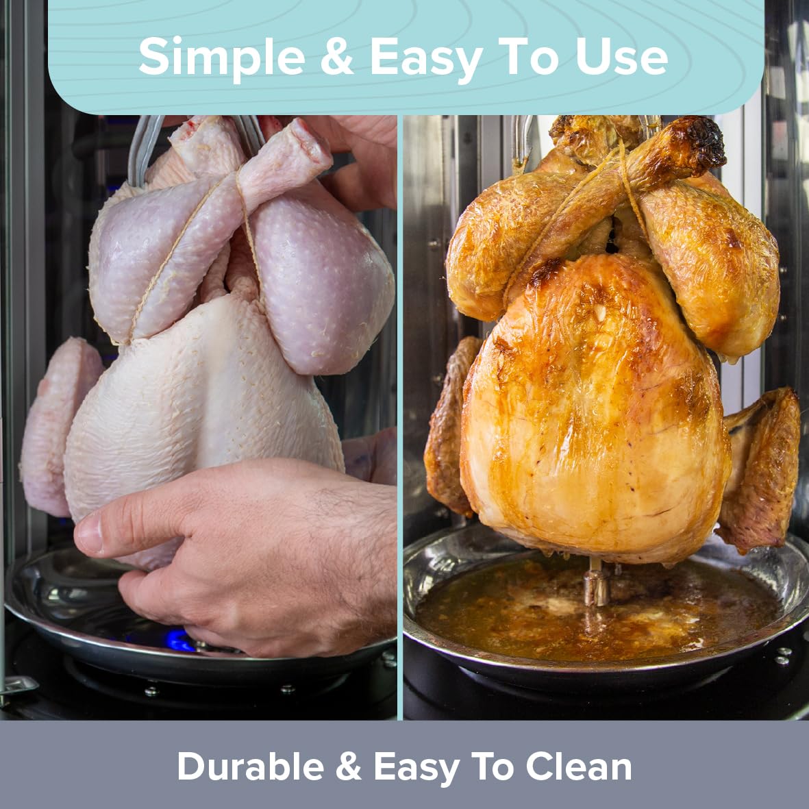 UPRIGHT COOKING – The foods will hang upright in the device, allowing the fats to roll down into the drip tray below. There is also a timer functionality that lets you set the heat for up to 60 minutes, and an auto shut-off safety device that will kick in if the door is opened during the cooking process.
