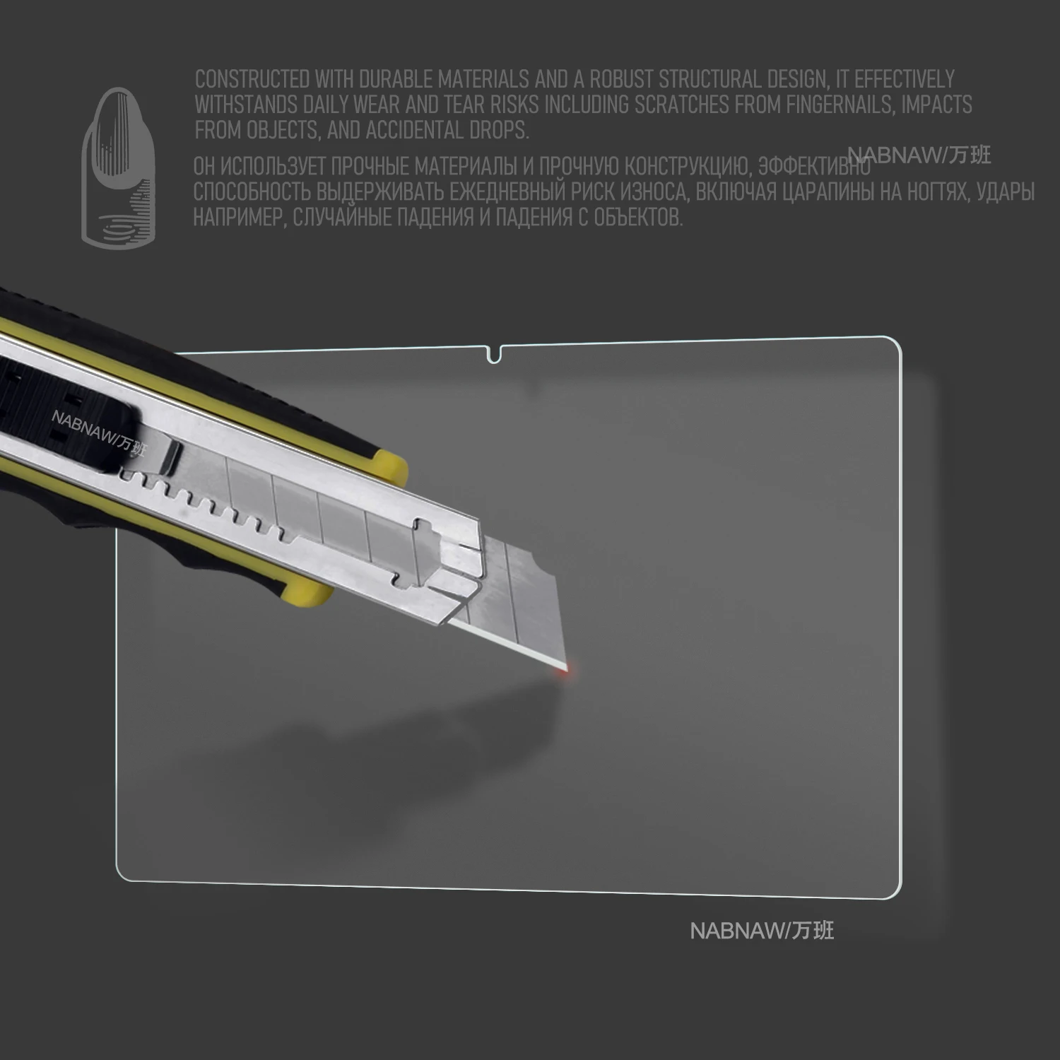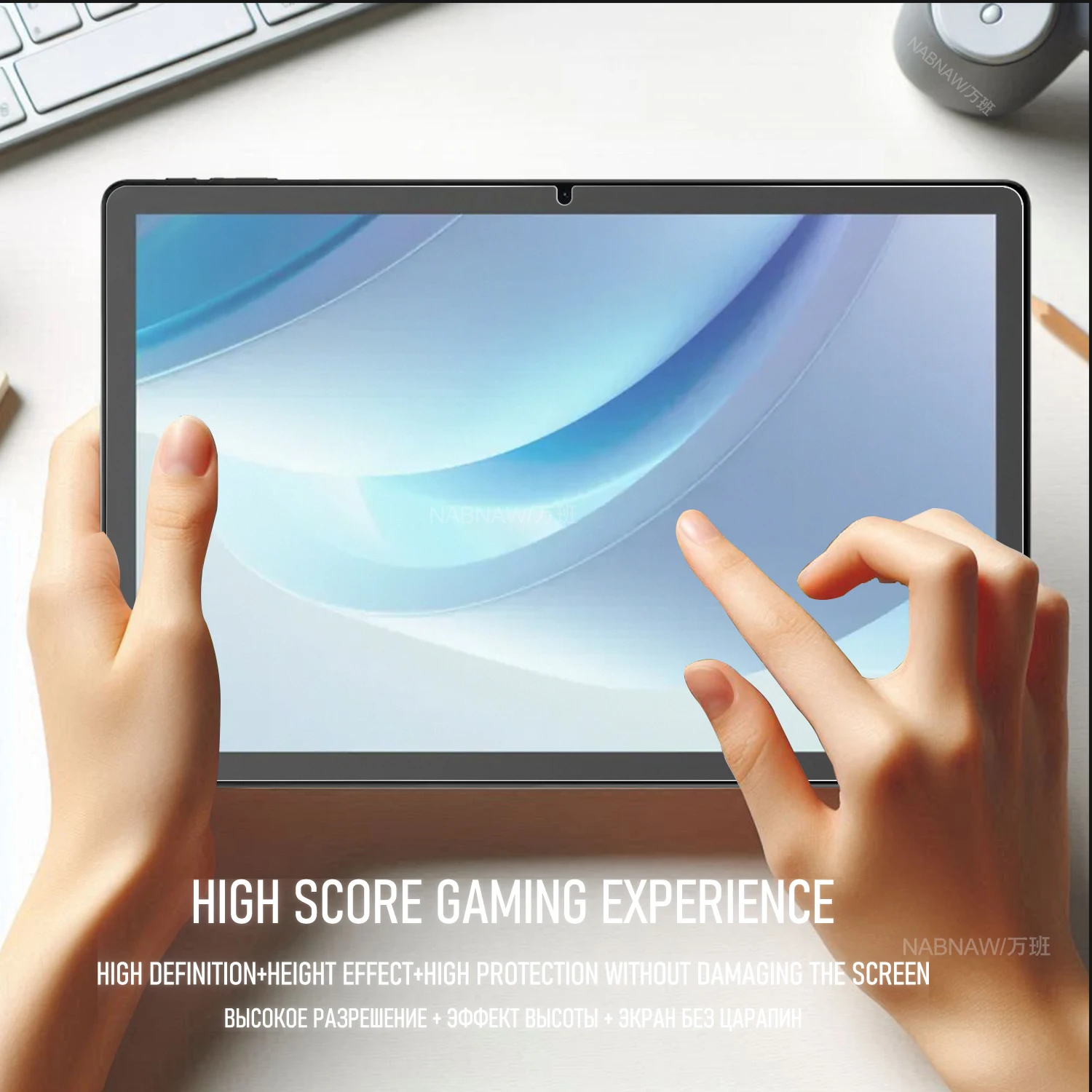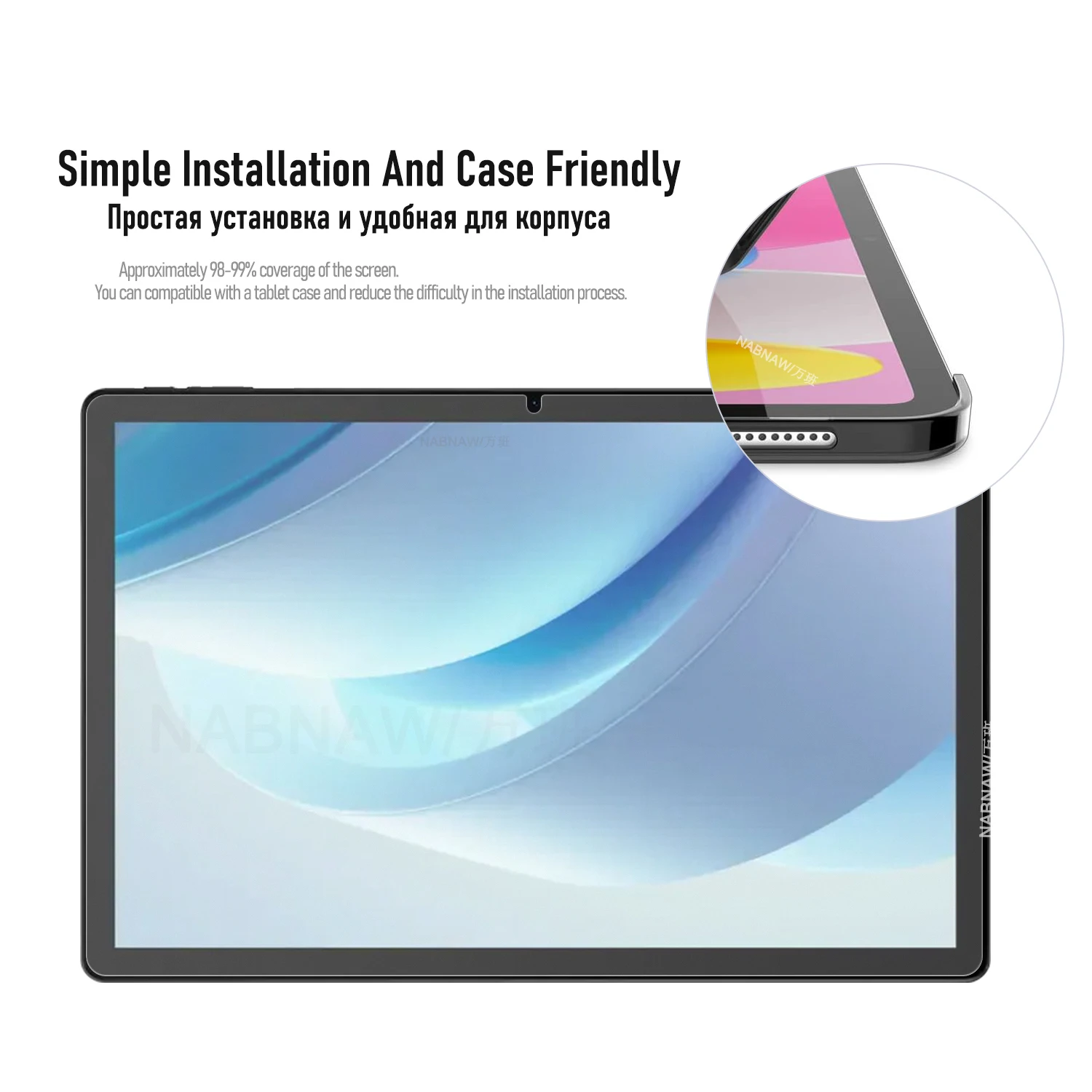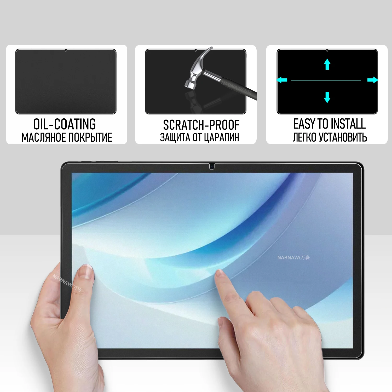 — tear off and discard the safety film of screen protector, calibrate the position of screen protector and tablet screen and slowly put it down.