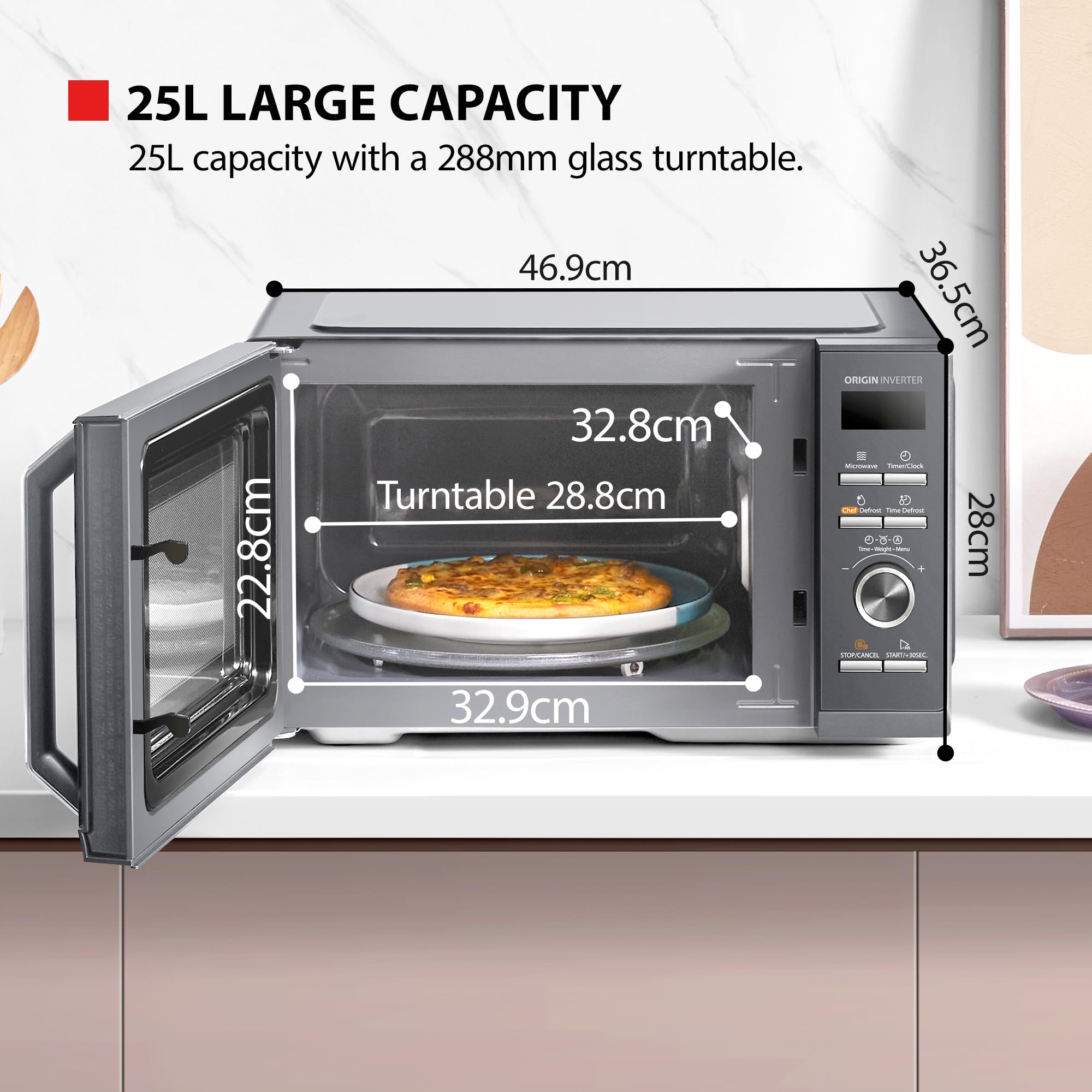 25L Large Capacity: Larger In Capacity, More Compact In Size; With a 288mm turntable, the 25L Microwave oven can accommodate the majority of dishes including a large 10″ pizza; The small footprint ensures it doesn’t take up too much worktop space