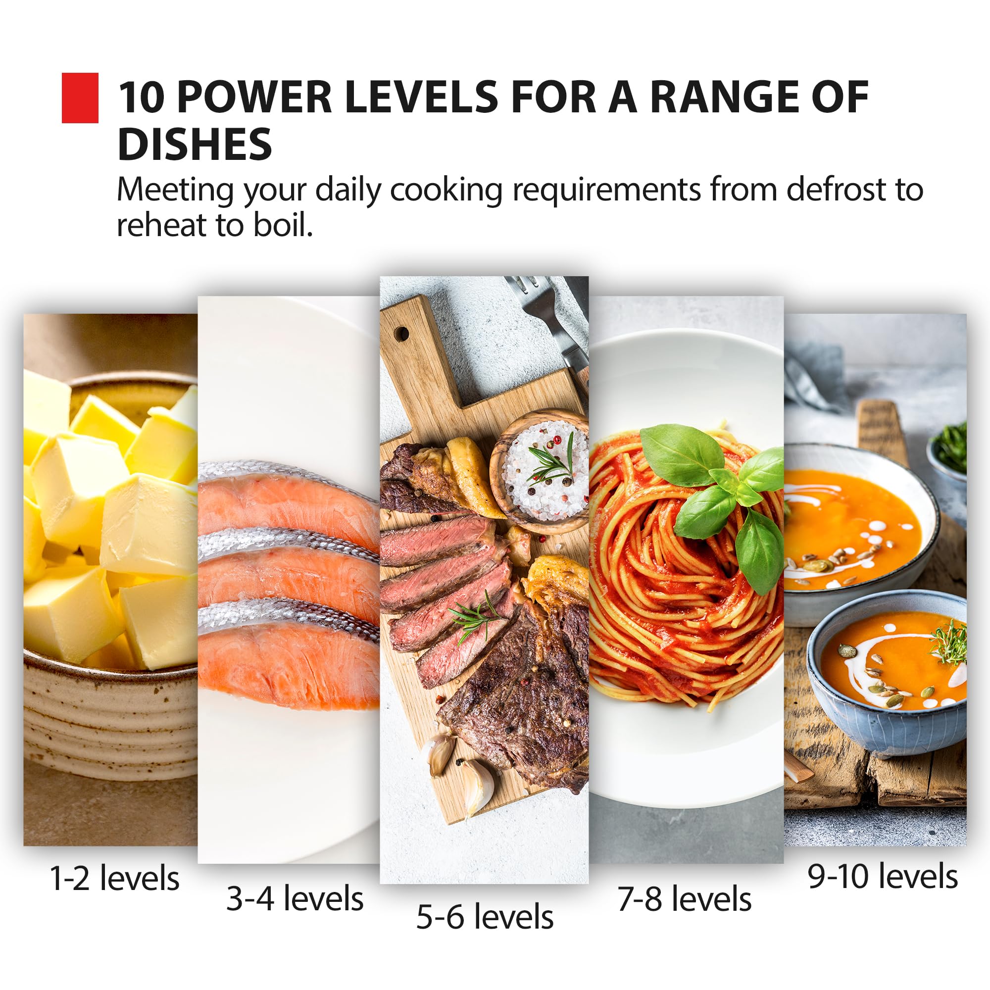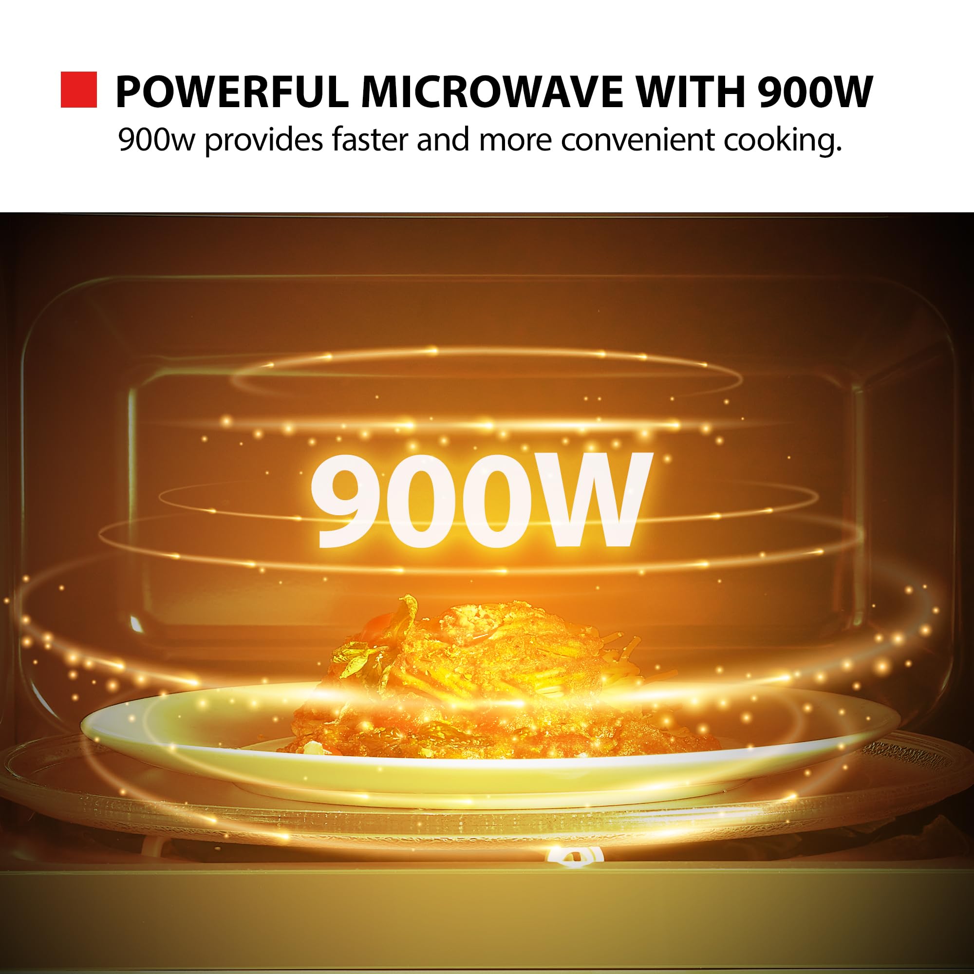 900W Microwave Power with 10 Power Level: This attractive 900W microwave is simple and easy to use; The 900W microwave and 7 auto menus provides quick and convenient cooking in your home