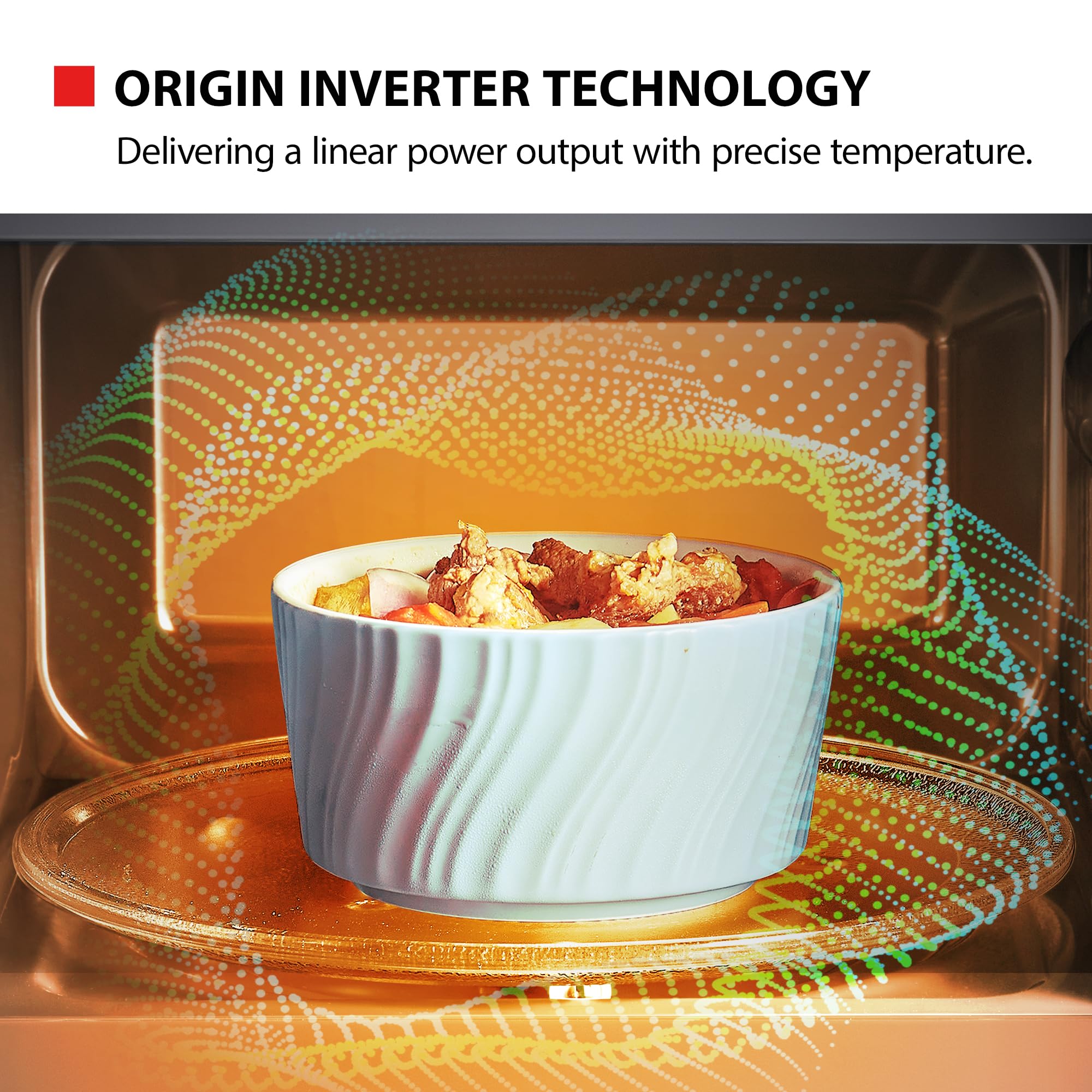 Origin Inverter: The ORIGIN INVERTER microwave deliver a linear power output with a precise temperature control; It shortens heating time and saves energy, replaces noisy transformers and capacitors to reduce noise levels to 57dB, making it super quiet